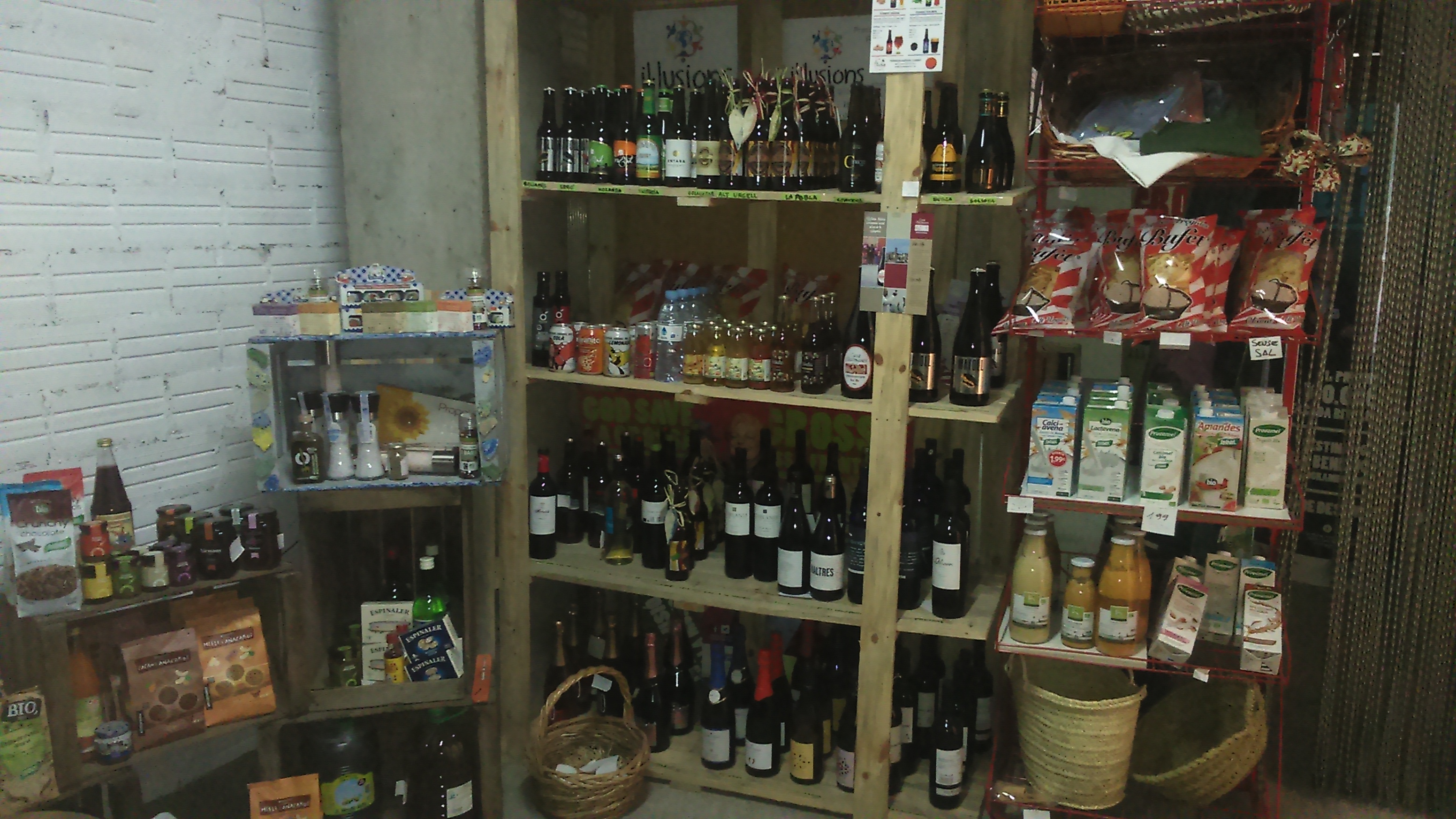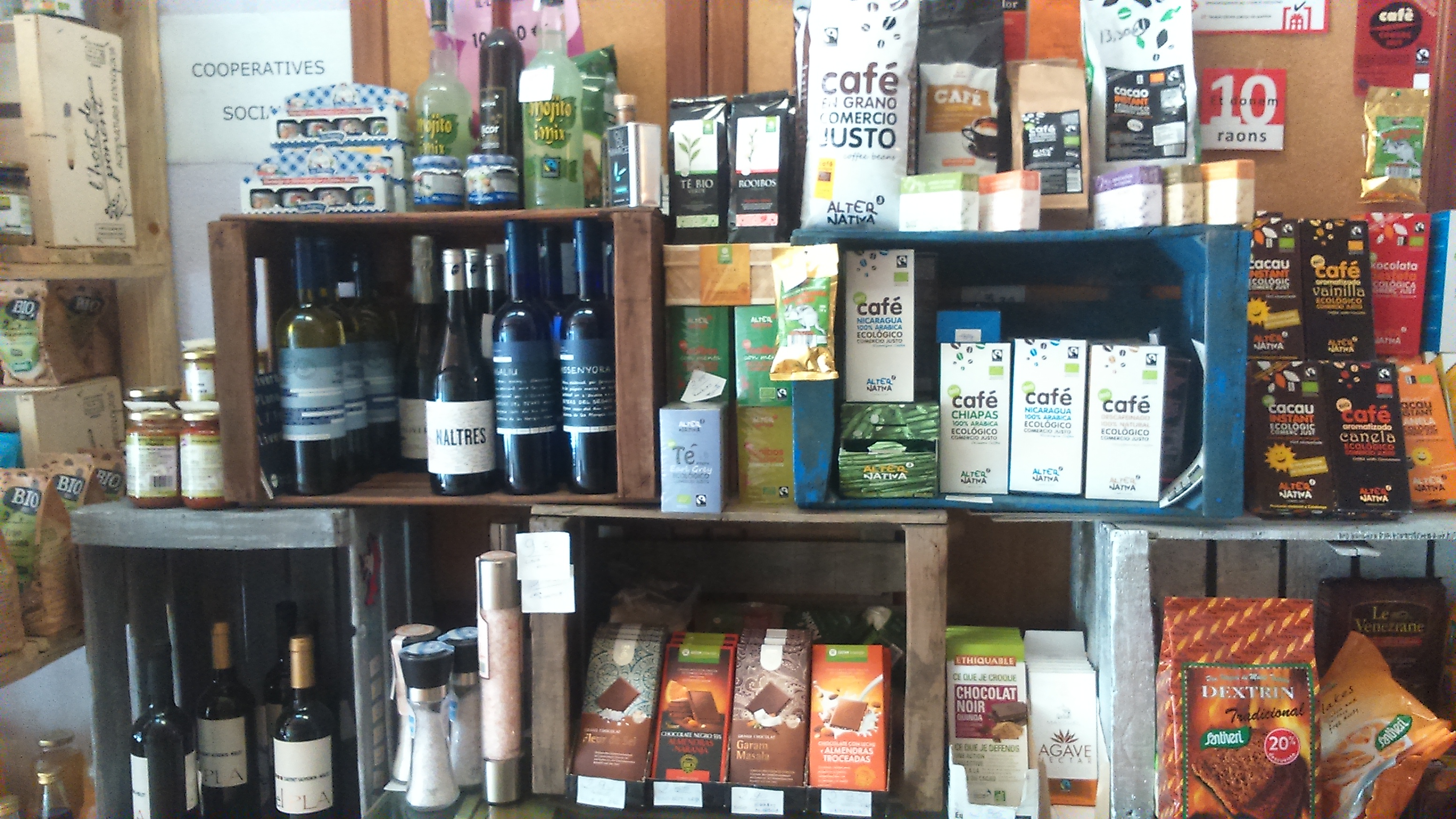 Cafè, cacau, xocolates, quinoa, sals, salses, melmelades, sucres, llibres d'editorials alternatives, tot tipus de llet o derivats làctics com formatges de la comarca o iogurts, productes aptes per a celíacs i vegans, pizzes i pasta fresca eco, vins, caves o cerveses de proximitat o cooperatives o biodinàmics. Bolquers i sabó eco, aigua de mar entre altres... També venem Loteria Catalana.
