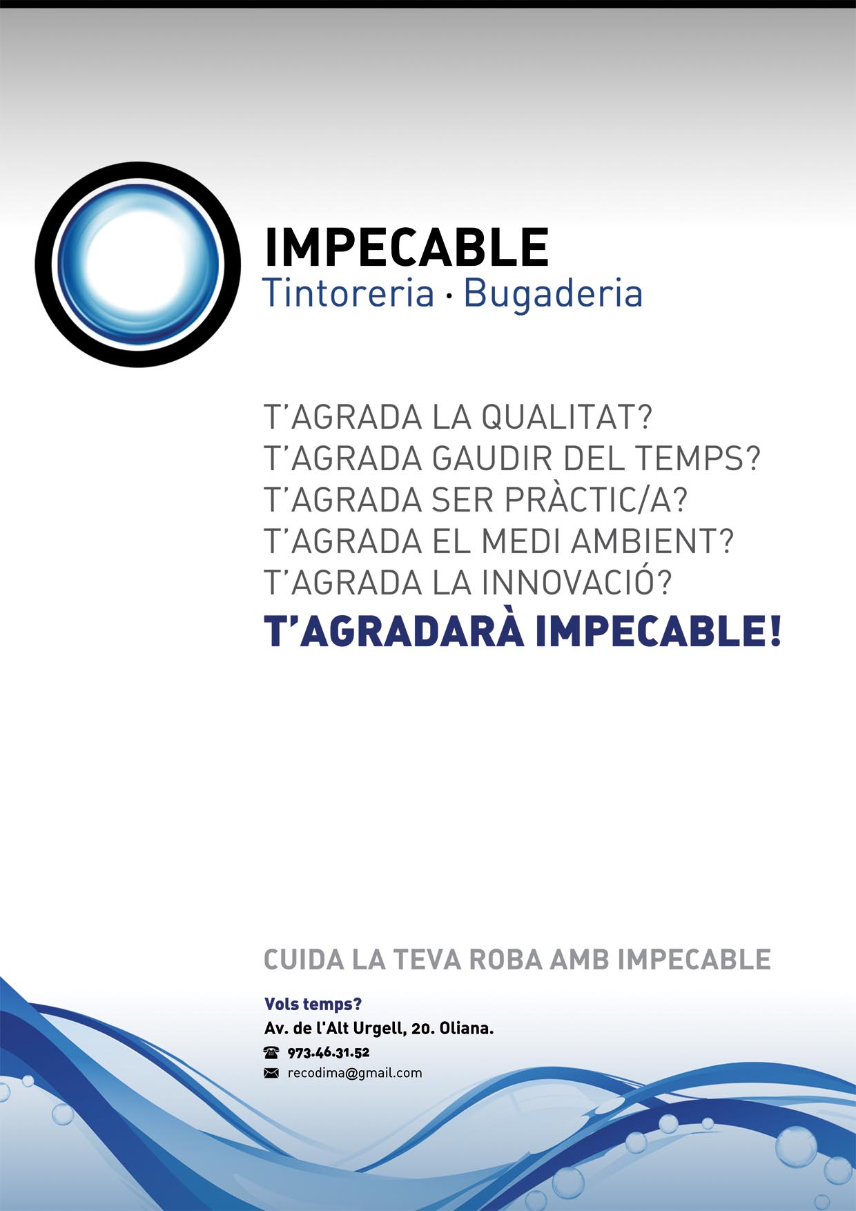 La Tintoreria-Bugaderia Impecable neix a Oliana per la Festa Major del 2010, amb l'entusiasme d'oferir als seus vilatans i turistes un nou servei de tintoreria de qualitat, certificada tant per la seva mà d'obra qualificada (titulada en Tintoreria, Bugaderia i Planxat, entre d'altres, per l'Escola Oficial de Tintorers i Bugaders) com per les seves màquines de darrera generació destacades per les seves tecnologies innovadores i absolutament respectuoses amb el medi ambient, molt més exigents ecològicament que la pròpia normativa nacional estableix.